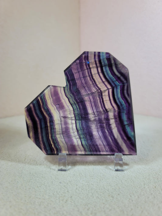 ( I ) High Quality Rainbow Candy Fluorite Faceted Heart w/FREE Stand